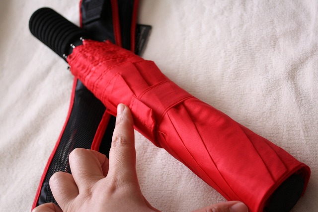 ボタンを押すとバっと傘が開くのですが、閉じる時もバっと閉じます。ちょっとビックリした(笑)なんでこんなにバっと開いたり閉じたりするんだ?と思ったら骨にバネが付いてました。納得。