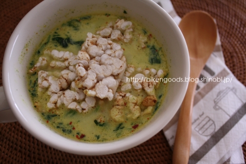 食べてみるとグリーンカレーの味がする!!!美味しい!!!ピリっと辛い刺激とココナッツのマイルドな味わい。雑穀畑を浸してリゾット風にして食べるのと、カレーを少し付けてサクッとした歯ざわりを楽しむ食べ方両方楽しみました。