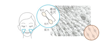 ※帯状毛穴とは ・・・広がった毛穴と毛穴がつながって見える現象。小鼻の横から頬にかけて広範囲に発生しやすく、冴えない老け顔の印象を与える原因に・・・。(下記の写真)