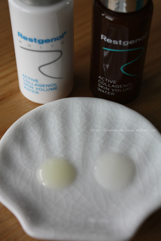 せっかくなので、ホワイトシリーズの美容液水と、従来の美容液水を比べてみました。ホワイトシリーズの方の色が練乳っぽいですね!どちらもテクスチャーはトロ~っとしています。化粧水の位置づけですが、美容液水と言っているだけあって、とろみ・保湿力が一般的な化粧水よりも高いです。少しの量でも、良く伸びて、すーっと肌に浸透していきます。ウッディ系な香りも◎!