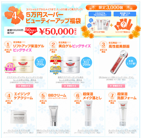 かなり、どれもお買い得度がある内容になっています。特に最後の5万円の福袋には、以前ご紹介して私も愛用している美顔器が入っています!!!どーいうことだーーー!!!美顔器気になるなーと思っていた方は是非この機会をお見逃しなく!