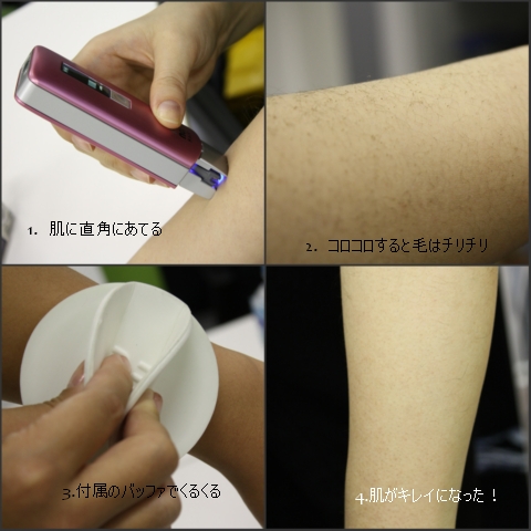 使い方はいたって簡単でした。毛のある肌に直角にあて、コロコロ転がします。すると、毛の焦げるニオイがしてきます。とてもイヤ~な感じですが毛を処理している証拠なので、少しの間ガマン、ガマン。処理された毛はチリチリになります。そしたら、付属のバッファで肌にくるくる滑らせるとツルツルになった肌になりました!