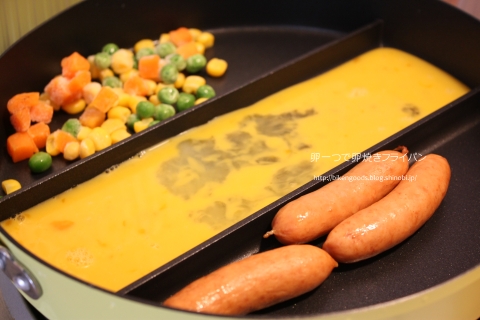 さあ~練習無しのぶっつけ本番で行きますよ!!!今回は朝食セットを作るため、冷凍のミックスベジタブル、ウインナー、卵焼きを一度に作ります!