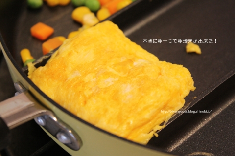 同時に3つの食材を入れて調理スタート!あ~ドキドキの卵焼き!上手く丸められかな・・・と思いながら縁から卵を寄せていきました。フライパンはテフロン加工してあるので一切油を引かなくてもペロっと卵もはがれて、丸めていく事が出来ました。ホントに卵一個で卵焼き出来ちゃったよ・・・。しかも、楽だし、早い!
