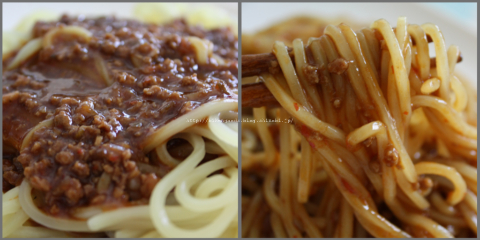 お皿に茹でた麺を乗せ、ソースをかけます。パッと見、ミートスパみたいですが(笑)これをよく混ぜ混ぜして食べます!