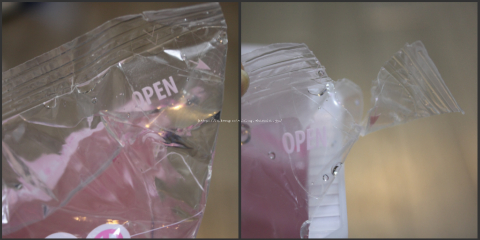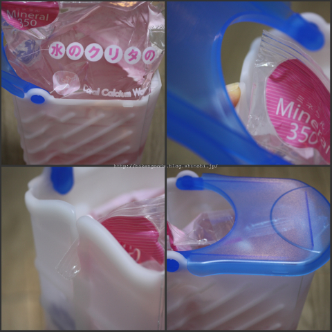 専用パックにお水の入った袋をセットします。スタンドパックに切込みが入っている(下記写真:右上)ので、そこにパックを固定します。(下記写真:左下)これでセット完了です!