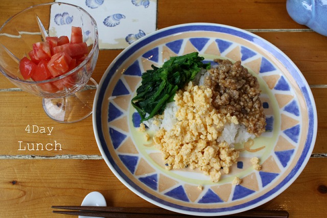 ●3色丼(とりそぼろ・ほうれん草・卵)