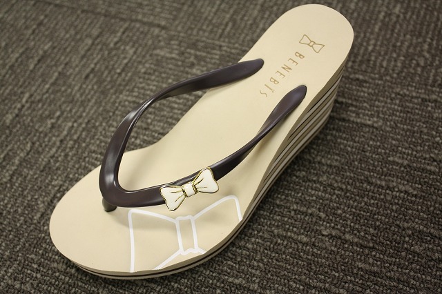 ビーチサンダルというとぺったんこのイメージですが、ハイヒールビーチサンダルというだけあって、ヒールの高さは8cm!足がスラリときれいに見えるのがいいですね!履き心地抜群のベネビス仕様なので、ヒールが高くても鼻緒の部分が痛くならないように工夫されているそうです。