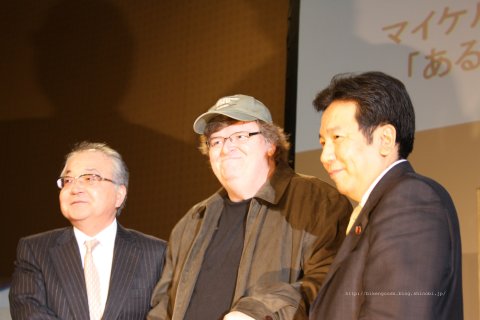 映画の試写が終わると、早稲田大学教授 篠田徹氏の司会で、マイケル・ムーア監督と日本労働組合総連合会会長 古賀伸明氏とのトークショーが行われました。また、最近注目の事業仕分けの“仕分け人”としてもおなじみの枝野幸男議員も飛び入り参加されました。
