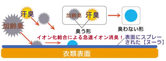 「ヌーラNULLA」の消臭方法は、従来の消臭方法(臭いを包み込む。別の臭いで打ち消す。)と異なり、加齢臭や汗臭と反応し、イオン化結合により消臭します。そのため、急速に!しかも!大容量の臭いの消臭を実現しました。さらに、加齢臭(ノネナール)も見事に消臭します。