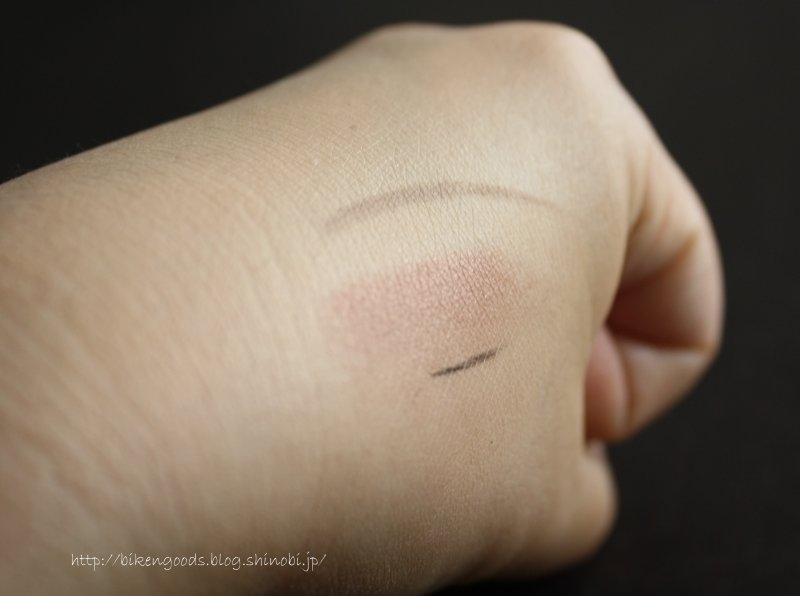 分かりやすいように手の甲に化粧してみました。ファンデーション、眉、アイシャドー、アイライン!