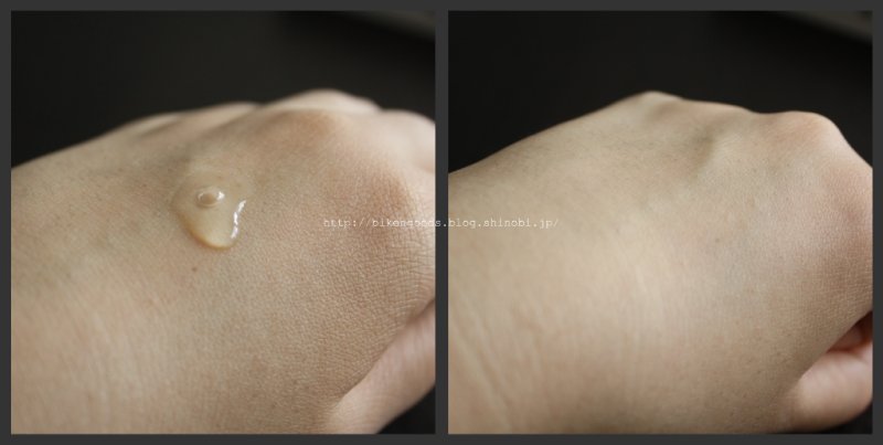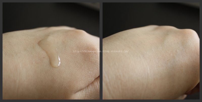 容器に入っている見た目的には、とろみのある化粧水なのかと思っていたのですが、さらっとした化粧水でした。右側の写真は化粧水を塗った後です。ス~っと染みこみ、その後は指が吸い付くほどしっとり、もっちり!!!