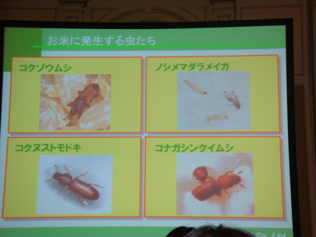 気をつけていても梅雨時期や夏などには虫が発生しちゃった~!!!ってことありますよね?ここでちょっと気持ち悪いですが、(この映像には会場にもざわめきが!)お米につく虫さんの紹介です・・・